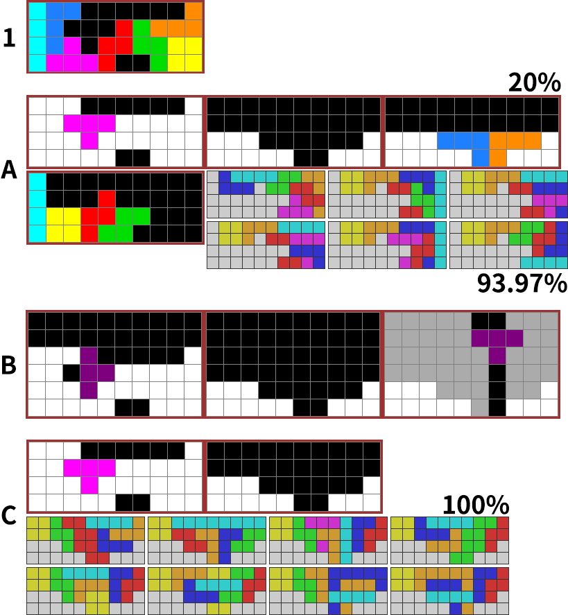 ▼ 이론적으로는 아래 상태에서 가방2 전체와 가방3의 1,2번미노, 총 9개로 96.65% PC를 할 수 있습니다. 하지만 해법만 해도 360개라서 첨부할 수 없고, 실용성도 없습니다.