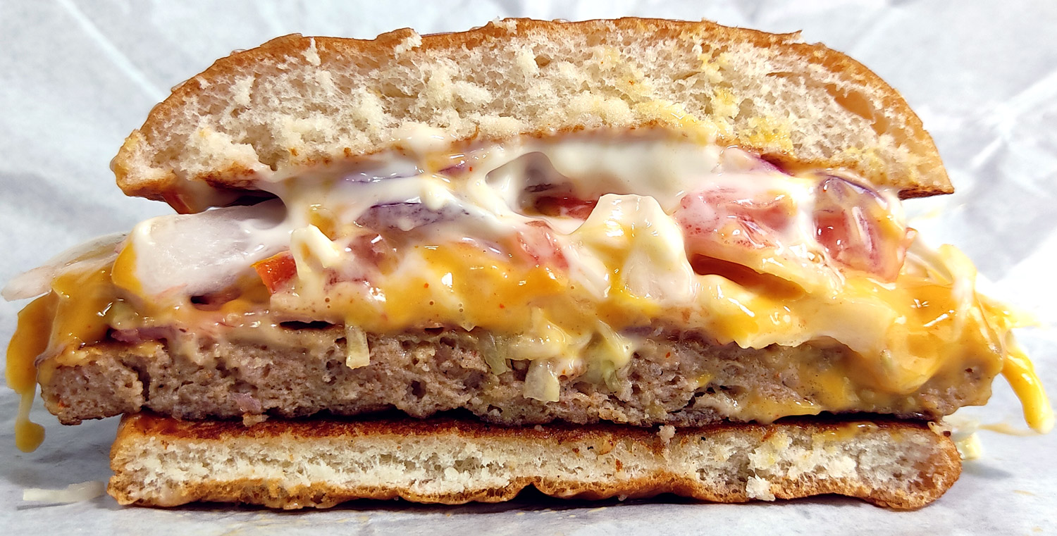 ▲ 단면 사진입니다. 돼지고기 패티에 치즈소스, 토마토, 양배추 등이 있어서 맛은 나름대로 괜찮습니다.