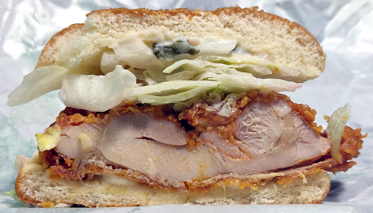 ▲ 단면사진입니다. 고기에 약간 매운 양념이 되어 있는 점, 닭다리살 패티 특유의 기름기·육즙이 있는 점을 확인할 수 있습니다.