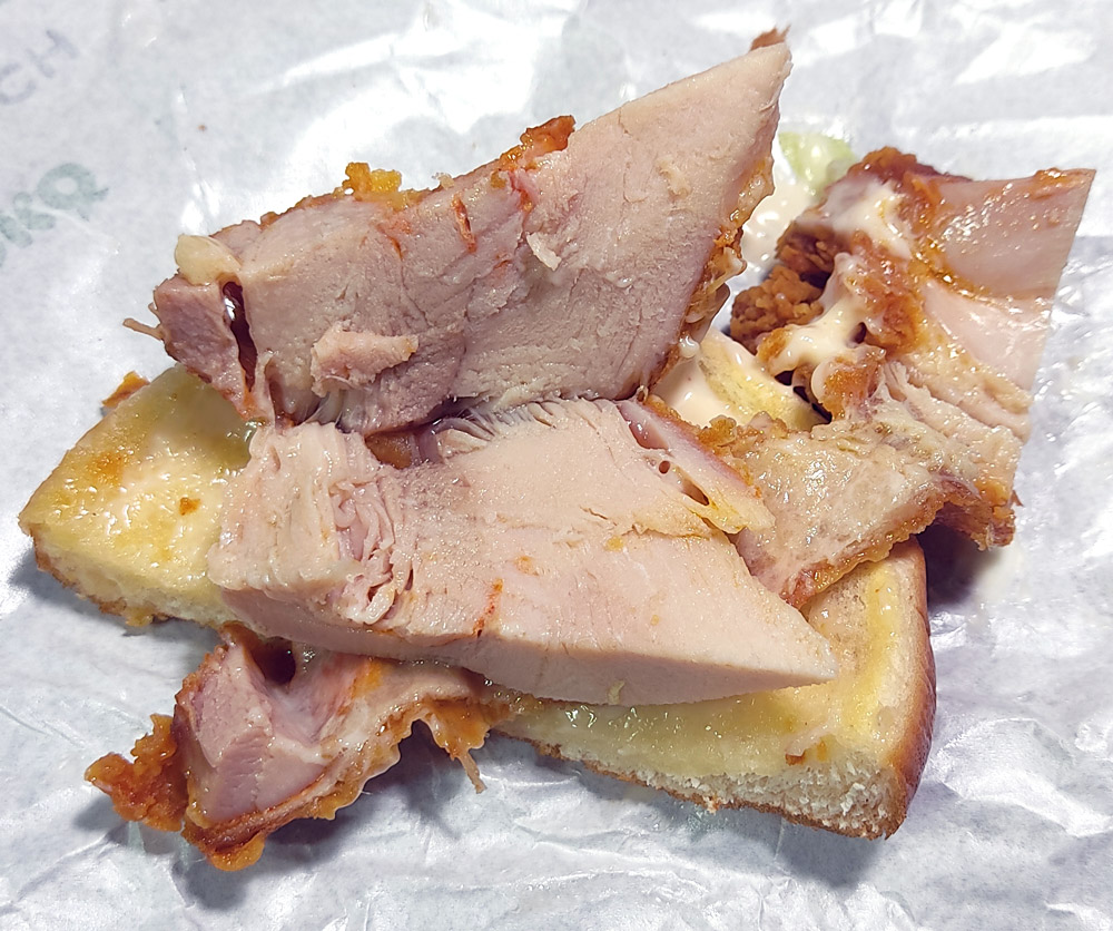 ▲ 닭다리살 패티입니다. 튀김옷이 약간 단단하기는 하지만, 조리 후 바로 받기 때문에 바삭합니다.
